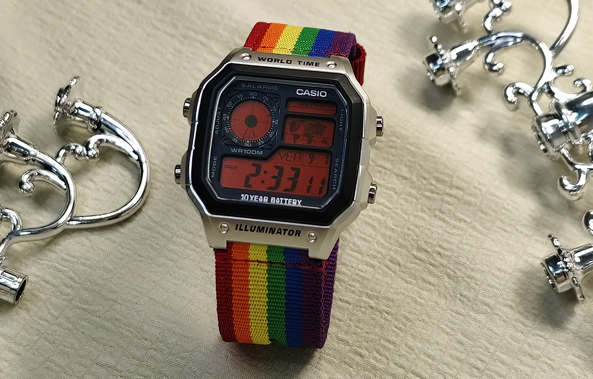 Custom AE-1200 mod with rainbow NATO strap, red display, and silver case. Features world time, 5 alarms, 100M water resistance, and 10-year battery life.