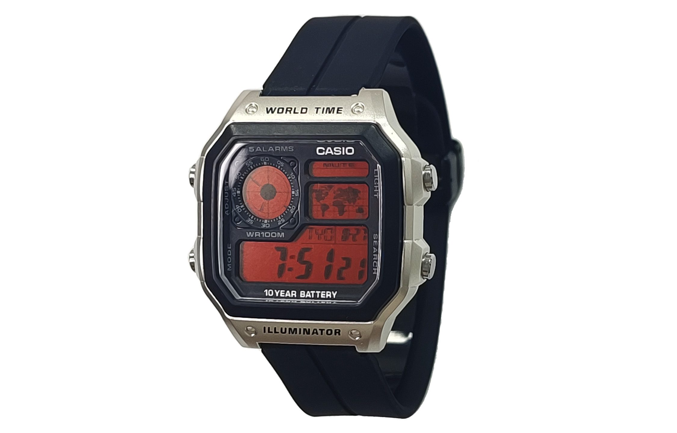 AE-1200WH-1A Casio World Time – Silver Case Red Display Black Resin