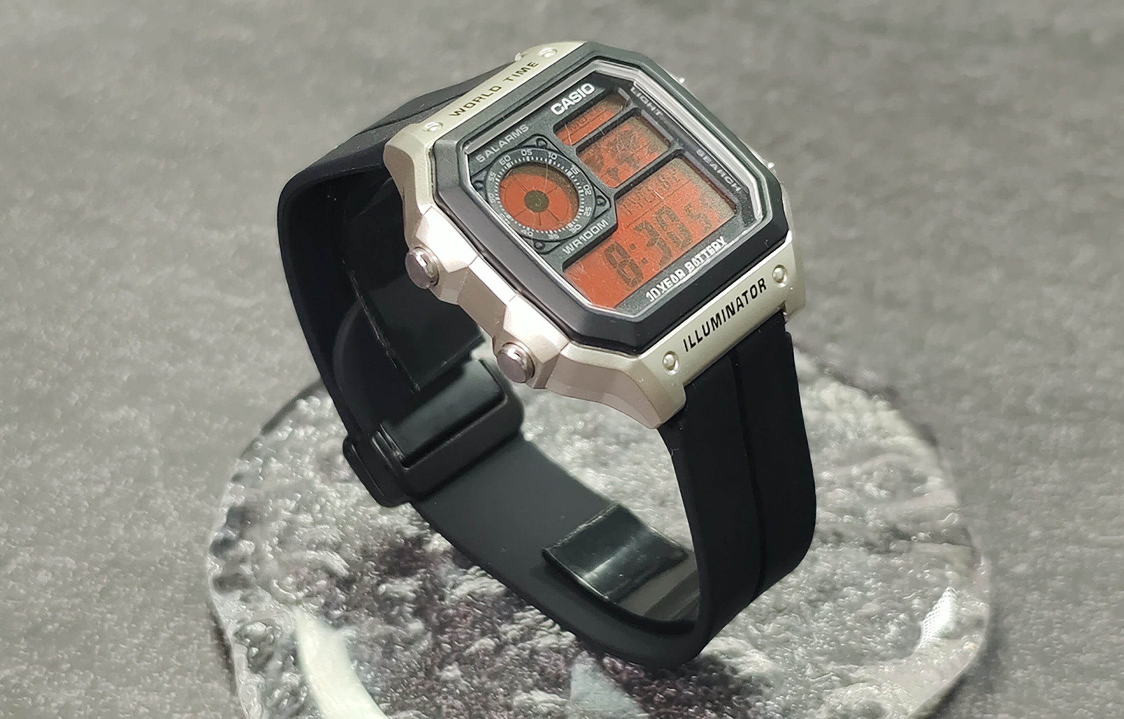 Custom AE-1200WH-1A mod with silver metal case, red display, and black resin strap. Features world time, 5 alarms, 100M water resistance, and 10-year battery life.