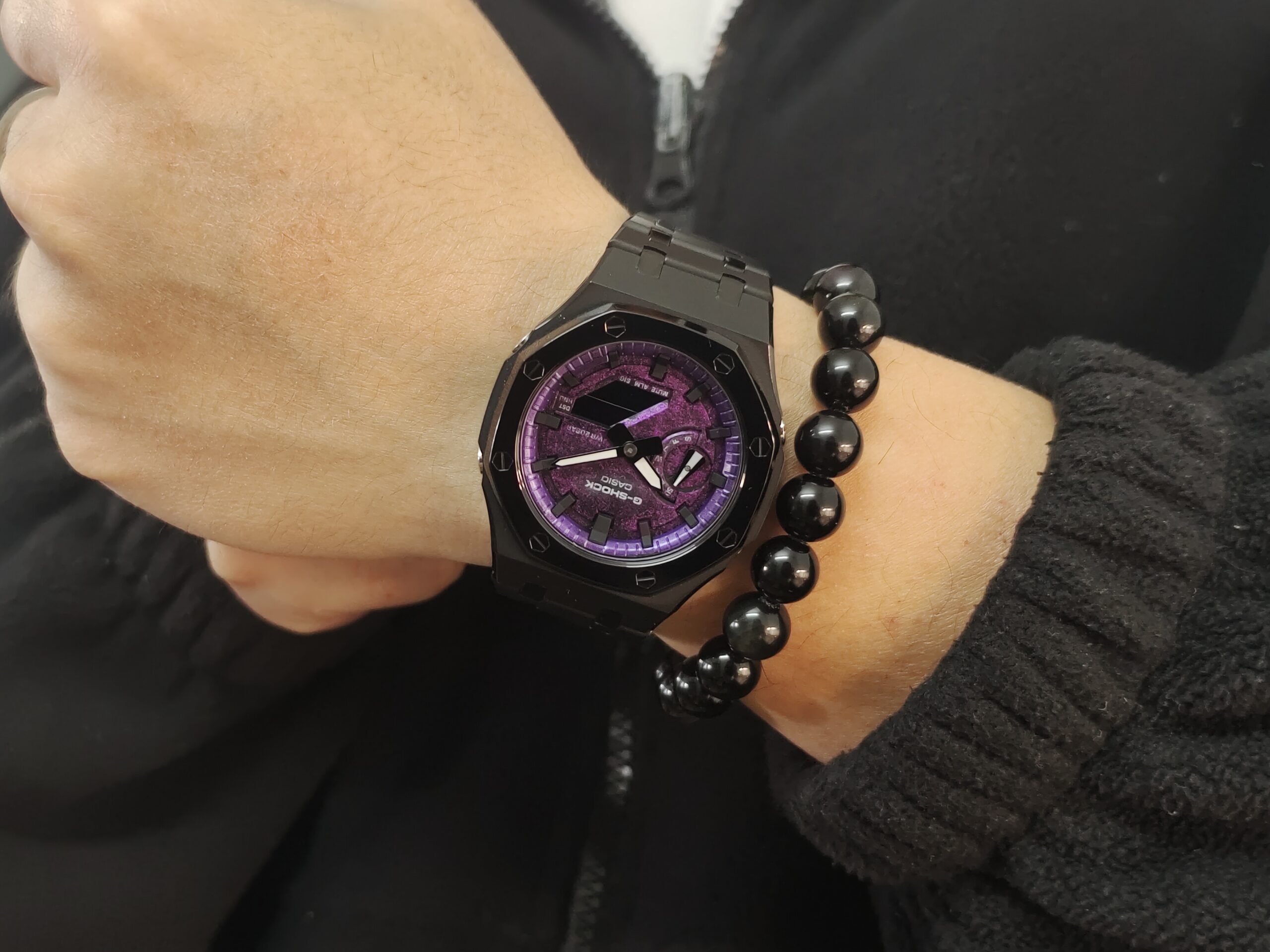 Introducing the stunning GA2100 CasiOak modification featuring a premium black metal case with eye-catching purple glitter dial. This unique timepiece combines G-SHOCK’s legendary durability with a fashionable purple dial that sparkles like stardust.
